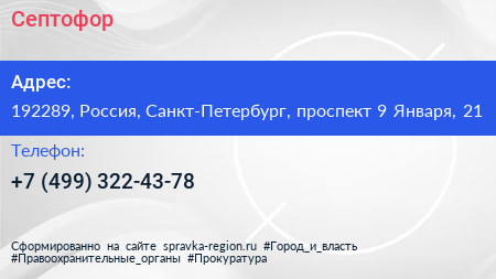 Септофор по адресу 192289, Россия, Санкт-Петербург, проспект 9 Января, 21 в дальнейшем Организация, размещена в следующих категориях: