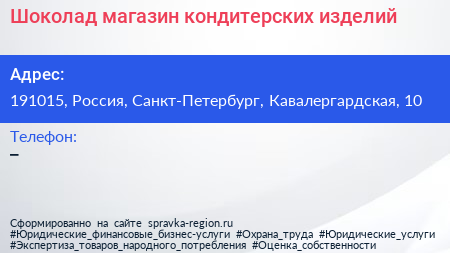 Шоколад, магазин кондитерских изделий по адресу 191015, Россия, Санкт-Петербург, Кавалергардская, 10 в дальнейшем Организация, размещена в следующих категориях: