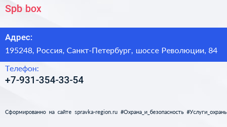 Spb-box по адресу 195248, Россия, Санкт-Петербург, шоссе Революции, 84 в дальнейшем Организация, размещена в следующих категориях: