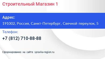 Строительный Магазин №1 по адресу 191002, Россия, Санкт-Петербург, Свечной переулок, 5 в дальнейшем Организация, размещена в следующих категориях: