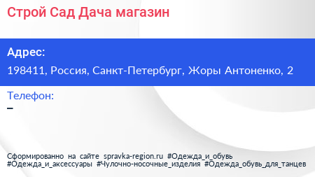 Строй Сад Дача, магазин по адресу 198411, Россия, Санкт-Петербург, Жоры Антоненко, 2 в дальнейшем Организация, размещена в следующих категориях: