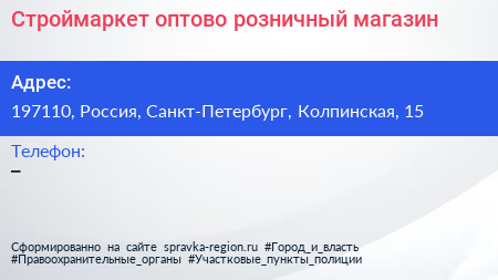 Строймаркет, оптово-розничный магазин по адресу 197110, Россия, Санкт-Петербург, Колпинская, 15 в дальнейшем Организация, размещена в следующих категориях: