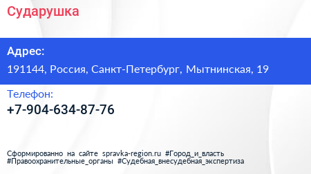 Сударушка по адресу 191144, Россия, Санкт-Петербург, Мытнинская, 19 в дальнейшем Организация, размещена в следующих категориях: