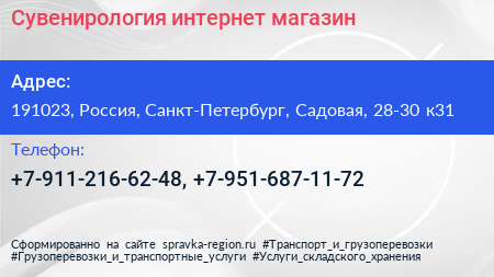 Сувенирология, интернет-магазин по адресу 191023, Россия, Санкт-Петербург, Садовая, 28-30 к31 в дальнейшем Организация, размещена в следующих категориях: