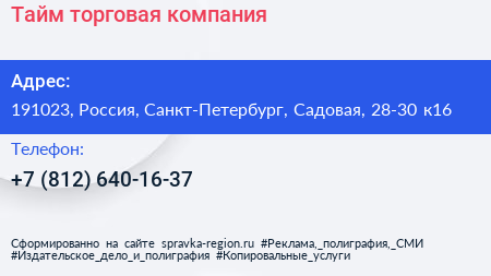 Тайм, торговая компания по адресу 191023, Россия, Санкт-Петербург, Садовая, 28-30 к16 в дальнейшем Организация, размещена в следующих категориях: