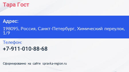 Тара-Гост по адресу 198095, Россия, Санкт-Петербург, Химический переулок, 1/9 в дальнейшем Организация, размещена в следующих категориях: