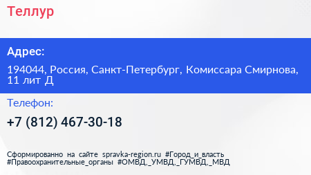 Теллур по адресу 194044, Россия, Санкт-Петербург, Комиссара Смирнова, 11 лит Д в дальнейшем Организация, размещена в следующих категориях: