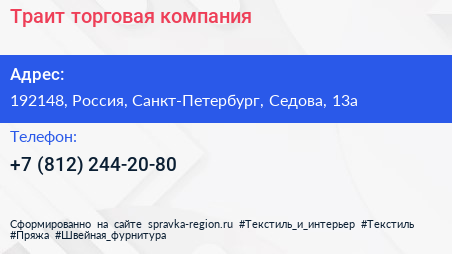 Траит, торговая компания по адресу 192148, Россия, Санкт-Петербург, Седова, 13а в дальнейшем Организация, размещена в следующих категориях: