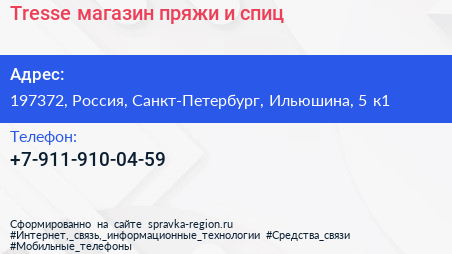 Tresse, магазин пряжи и спиц по адресу 197372, Россия, Санкт-Петербург, Ильюшина, 5 к1 в дальнейшем Организация, размещена в следующих категориях: