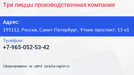 Три пиццы, производственная компания по адресу 195112, Россия, Санкт-Петербург, Уткин проспект, 13 к1 в дальнейшем Организация, размещена в следующих категориях: