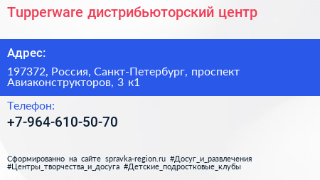 Tupperware, дистрибьюторский центр по адресу 197372, Россия, Санкт-Петербург, проспект Авиаконструкторов, 3 к1 в дальнейшем Организация, размещена в следующих категориях: