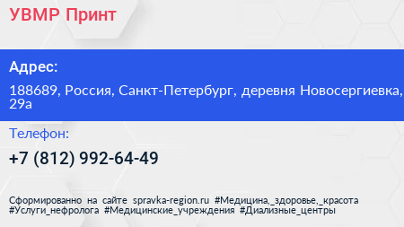 УВМР-Принт по адресу 188689, Россия, Санкт-Петербург, деревня Новосергиевка, 29а в дальнейшем Организация, размещена в следующих категориях: