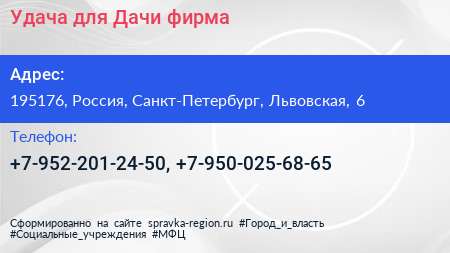 Удача для Дачи, фирма по адресу 195176, Россия, Санкт-Петербург, Львовская, 6 в дальнейшем Организация, размещена в следующих категориях: