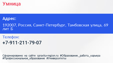 Умница по адресу 192007, Россия, Санкт-Петербург, Тамбовская улица, 69 лит Б в дальнейшем Организация, размещена в следующих категориях: