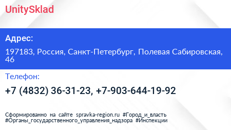 UnitySklad по адресу 197183, Россия, Санкт-Петербург, Полевая Сабировская, 46 в дальнейшем Организация, размещена в следующих категориях: