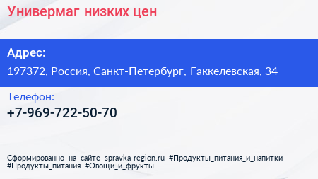 Универмаг низких цен по адресу 197372, Россия, Санкт-Петербург, Гаккелевская, 34 в дальнейшем Организация, размещена в следующих категориях: