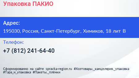 Упаковка ПАКИО по адресу 195030, Россия, Санкт-Петербург, Химиков, 18 лит В в дальнейшем Организация, размещена в следующих категориях:
