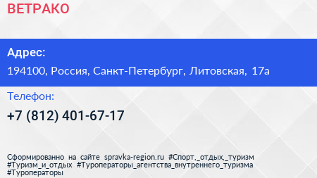 ВЕТРАКО по адресу 194100, Россия, Санкт-Петербург, Литовская, 17а в дальнейшем Организация, размещена в следующих категориях: