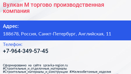 Вулкан-М, торгово-производственная компания по адресу 188678, Россия, Санкт-Петербург, Английская, 11 в дальнейшем Организация, размещена в следующих категориях: