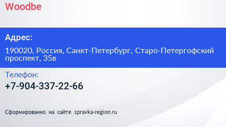 Woodbe по адресу 190020, Россия, Санкт-Петербург, Старо-Петергофский проспект, 35в в дальнейшем Организация, размещена в следующих категориях: