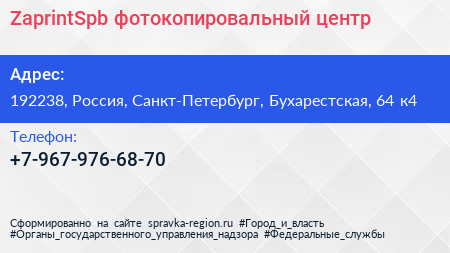 ZaprintSpb, фотокопировальный центр по адресу 192238, Россия, Санкт-Петербург, Бухарестская, 64 к4 в дальнейшем Организация, размещена в следующих категориях:
