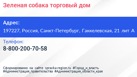 Зеленая собака, торговый дом по адресу 197227, Россия, Санкт-Петербург, Гаккелевская, 21 лит А в дальнейшем Организация, размещена в следующих категориях: