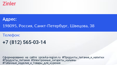 Zinler по адресу 198095, Россия, Санкт-Петербург, Швецова, 38 в дальнейшем Организация, размещена в следующих категориях: