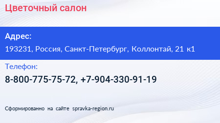 Цветочный салон по адресу 193231, Россия, Санкт-Петербург, Коллонтай, 21 к1 в дальнейшем Организация, размещена в следующих категориях: