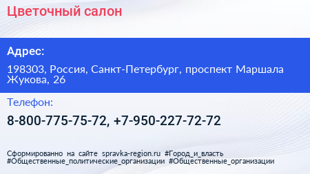 Цветочный салон по адресу 198303, Россия, Санкт-Петербург, проспект Маршала Жукова, 26 в дальнейшем Организация, размещена в следующих категориях: