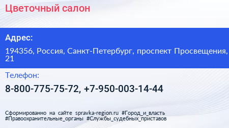 Цветочный салон по адресу 194356, Россия, Санкт-Петербург, проспект Просвещения, 21 в дальнейшем Организация, размещена в следующих категориях: