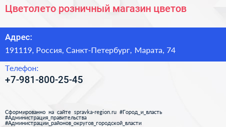 Цветолето, розничный магазин цветов по адресу 191119, Россия, Санкт-Петербург, Марата, 74 в дальнейшем Организация, размещена в следующих категориях:
