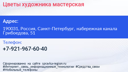 Цветы художника, мастерская по адресу 190031, Россия, Санкт-Петербург, набережная канала Грибоедова, 51 в дальнейшем Организация, размещена в следующих категориях: