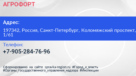 АГРОФОРТ по адресу 197342, Россия, Санкт-Петербург, Коломяжский проспект, 1/61 в дальнейшем Организация, размещена в следующих категориях: