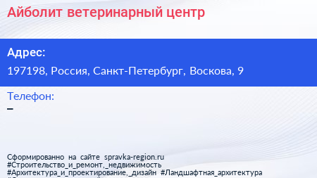 Айболит, ветеринарный центр по адресу 197198, Россия, Санкт-Петербург, Воскова, 9 в дальнейшем Организация, размещена в следующих категориях: