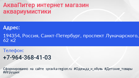 АкваПитер, интернет-магазин аквариумистики по адресу 194354, Россия, Санкт-Петербург, проспект Луначарского, 62 к2 в дальнейшем Организация, размещена в следующих категориях: