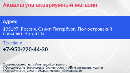 Аквалагуна, аквариумный магазин по адресу 195197, Россия, Санкт-Петербург, Полюстровский проспект, 45 лит Б в дальнейшем Организация, размещена в следующих категориях: