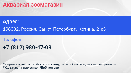 Аквариал, зоомагазин по адресу 198332, Россия, Санкт-Петербург, Котина, 2 к3 в дальнейшем Организация, размещена в следующих категориях: