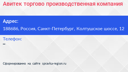 Авитек, торгово-производственная компания по адресу 188686, Россия, Санкт-Петербург, Колтушское шоссе, 12 в дальнейшем Организация, размещена в следующих категориях: