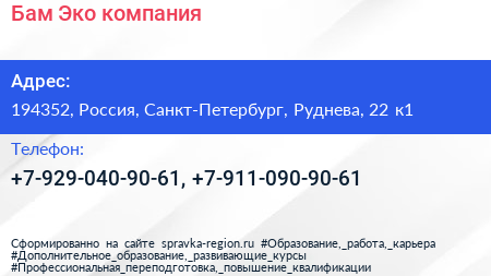 Бам-Эко, компания по адресу 194352, Россия, Санкт-Петербург, Руднева, 22 к1 в дальнейшем Организация, размещена в следующих категориях: