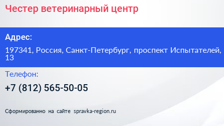 Честер, ветеринарный центр по адресу 197341, Россия, Санкт-Петербург, проспект Испытателей, 13 в дальнейшем Организация, размещена в следующих категориях: