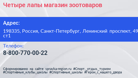 Четыре лапы, магазин зоотоваров по адресу 198335, Россия, Санкт-Петербург, Ленинский проспект, 49 ст1 в дальнейшем Организация, размещена в следующих категориях: