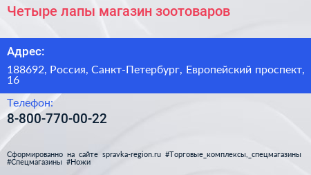 Четыре лапы, магазин зоотоваров по адресу 188692, Россия, Санкт-Петербург, Европейский проспект, 16 в дальнейшем Организация, размещена в следующих категориях: