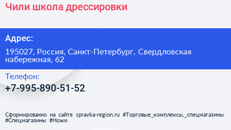 Чили, школа дрессировки по адресу 195027, Россия, Санкт-Петербург, Свердловская набережная, 62 в дальнейшем Организация, размещена в следующих категориях:
