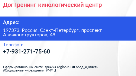 ДогТренинг, кинологический центр по адресу 197373, Россия, Санкт-Петербург, проспект Авиаконструкторов, 49 в дальнейшем Организация, размещена в следующих категориях: