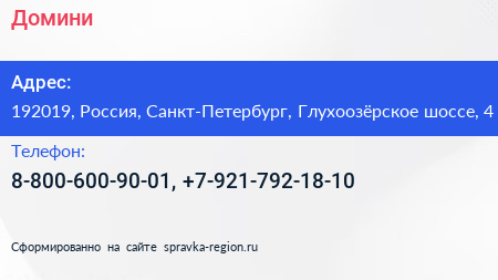 Домини по адресу 192019, Россия, Санкт-Петербург, Глухоозёрское шоссе, 4 в дальнейшем Организация, размещена в следующих категориях: