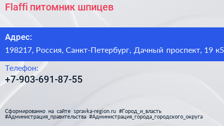 Flaffi, питомник шпицев по адресу 198217, Россия, Санкт-Петербург, Дачный проспект, 19 к5 в дальнейшем Организация, размещена в следующих категориях: