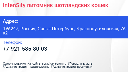 IntenSity, питомник шотландских кошек по адресу 196247, Россия, Санкт-Петербург, Краснопутиловская, 76 к2 в дальнейшем Организация, размещена в следующих категориях: