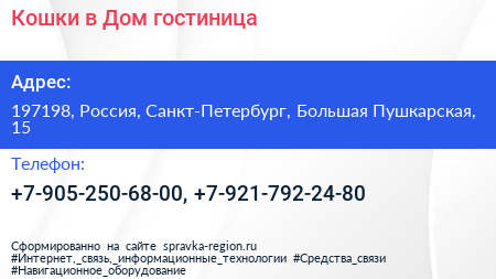 Кошки в Дом, гостиница по адресу 197198, Россия, Санкт-Петербург, Большая Пушкарская, 15 в дальнейшем Организация, размещена в следующих категориях: