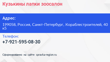 Кузькины лапки, зоосалон по адресу 199058, Россия, Санкт-Петербург, Кораблестроителей, 40 к5 в дальнейшем Организация, размещена в следующих категориях: