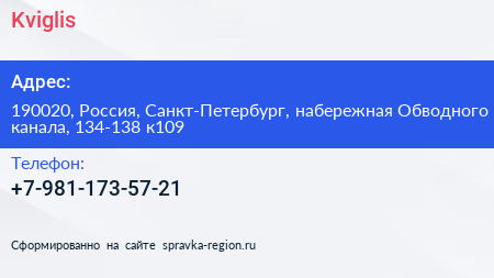 Kviglis по адресу 190020, Россия, Санкт-Петербург, набережная Обводного канала, 134-138 к109 в дальнейшем Организация, размещена в следующих категориях: